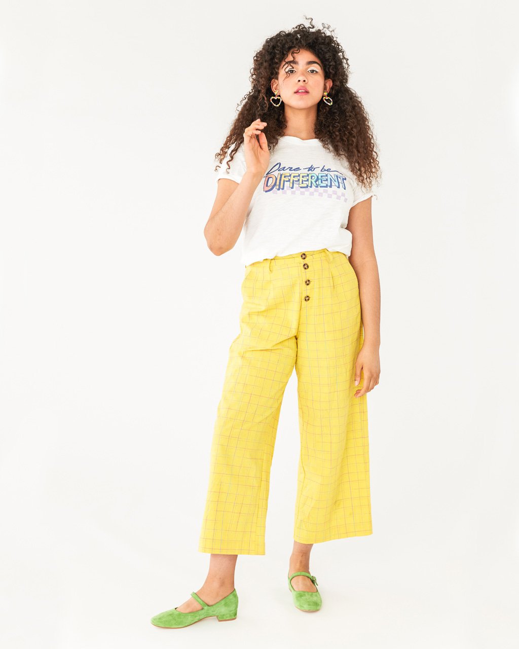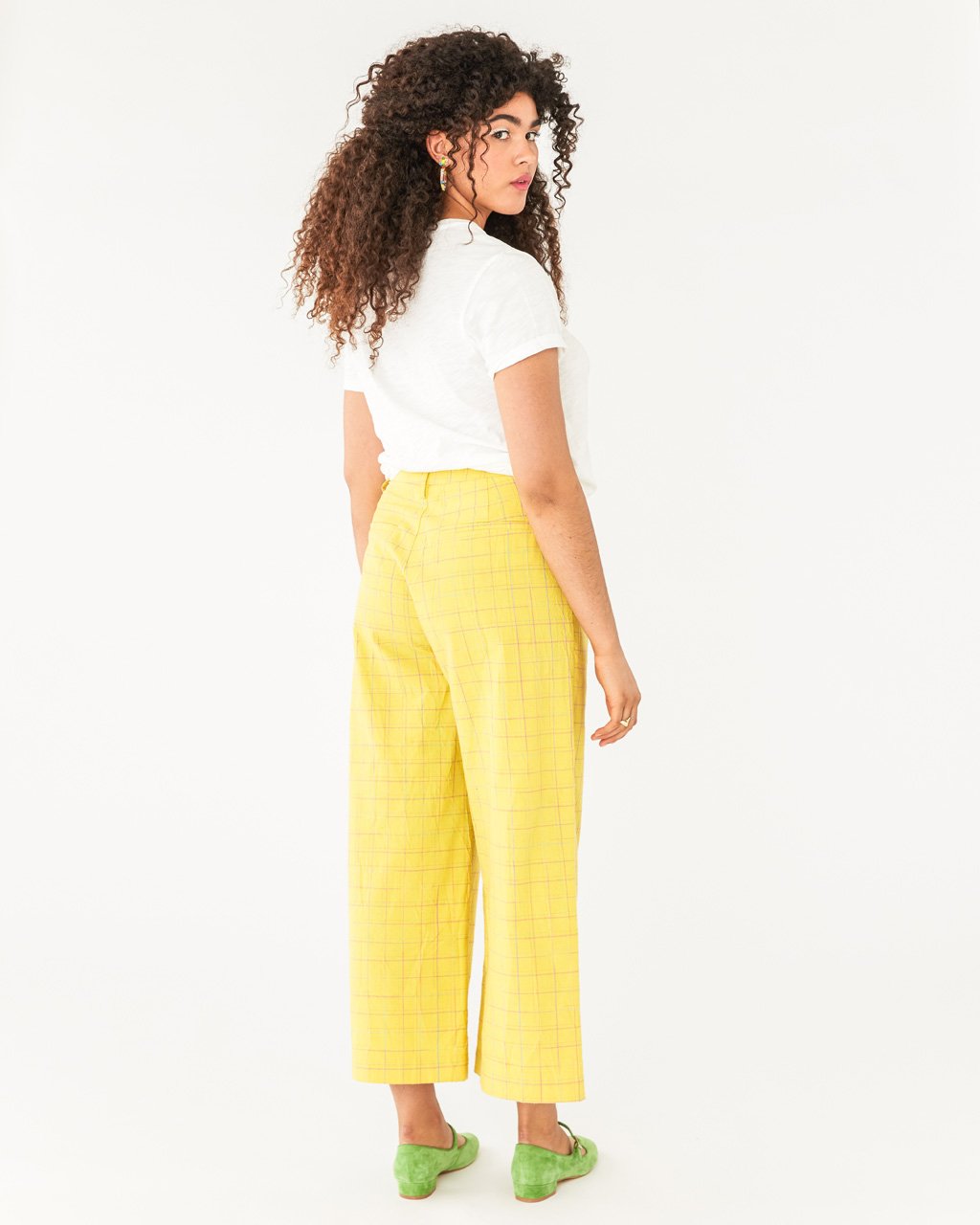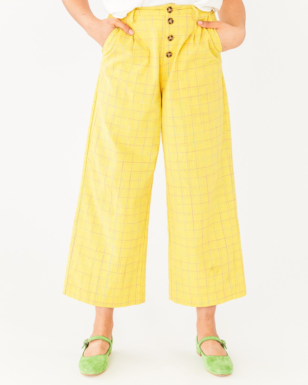 According to the ancient proverb, yellow pants are always a good idea. These yellow pants from Saint Geraldine have a light grid pattern, high waist, and exposed button front.