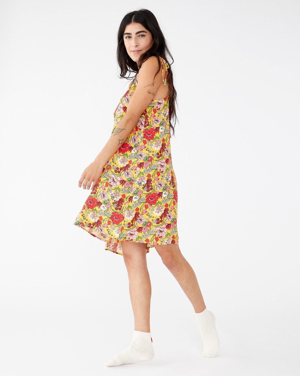 Sure, we originally made this dress for you to sleep in, but it easily doubles as an outside dress, too! It’s got a baby doll fit, adjustable tie straps, and our superbloom pattern in bright yellow.