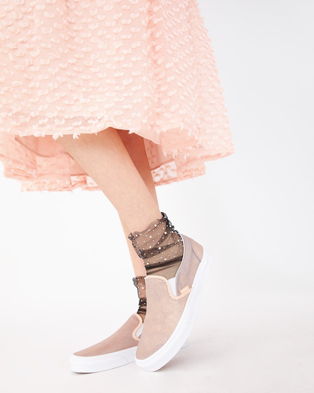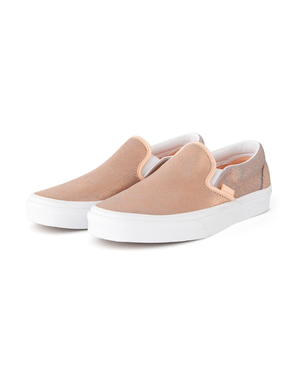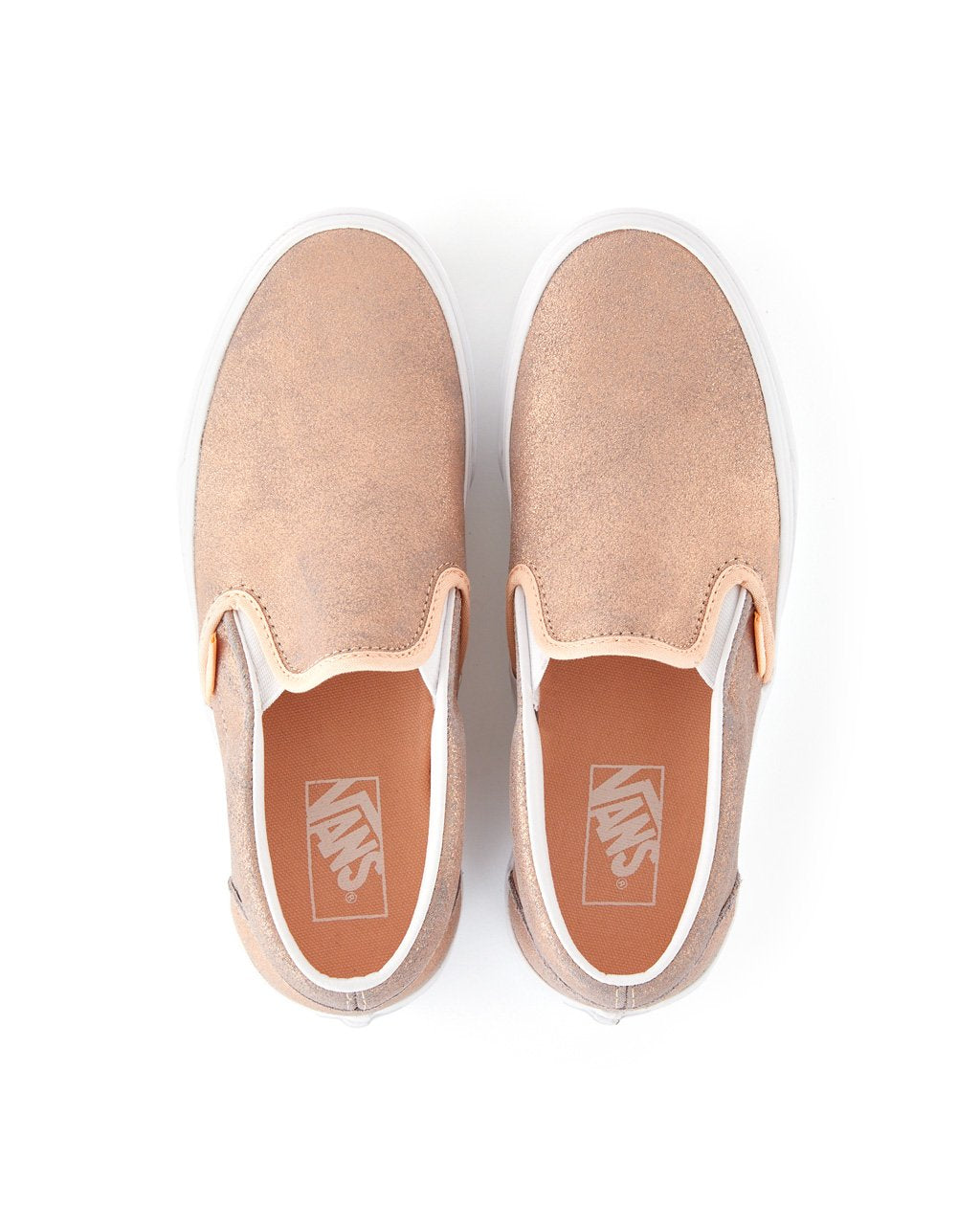 You know these shoes and you love these shoes. They’re classic Vans slip-ons! What more can we say? That this pair has metallic leather uppers in the perfect shade of rose gold? Yeah, we could say that.