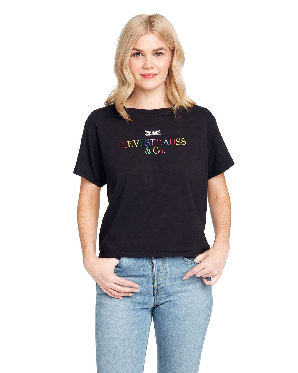 Levi's Varsity Text Logo top is a relaxed, boxy cut tee with short sleeves featuring a multi-color text graphic and the two horses logo across the chest.