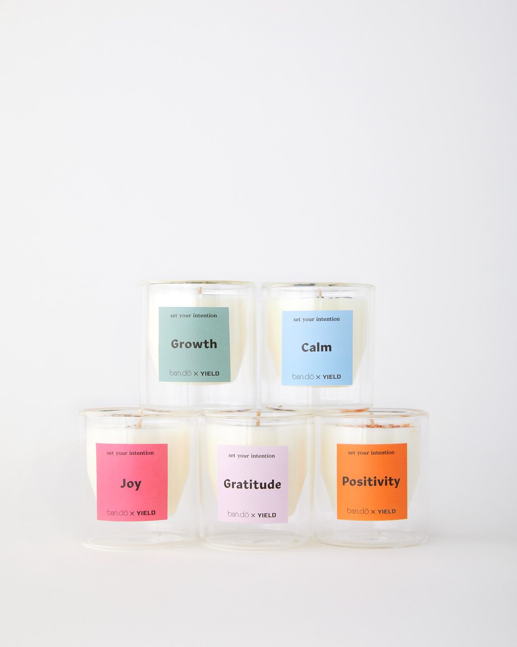 We worked with our friends at Yield to make candles full of intention (and full of nice scents, of course). With notes of eucalyptus and birch, this candle was made to help promote your personal growth. Plus, it has green soy wax chips that melt together when you light it to make a cool green layer on top!