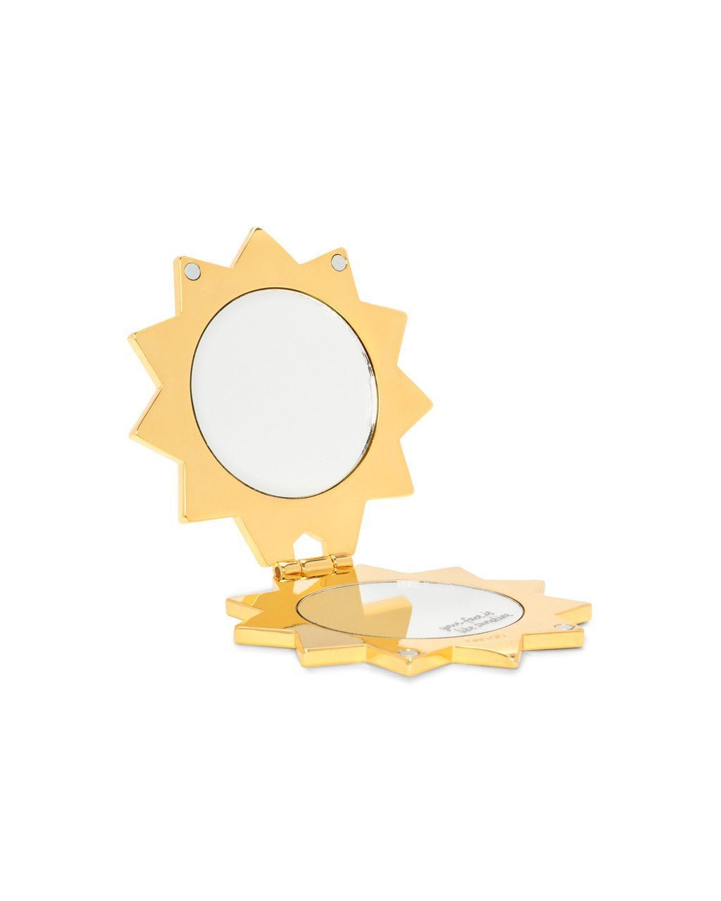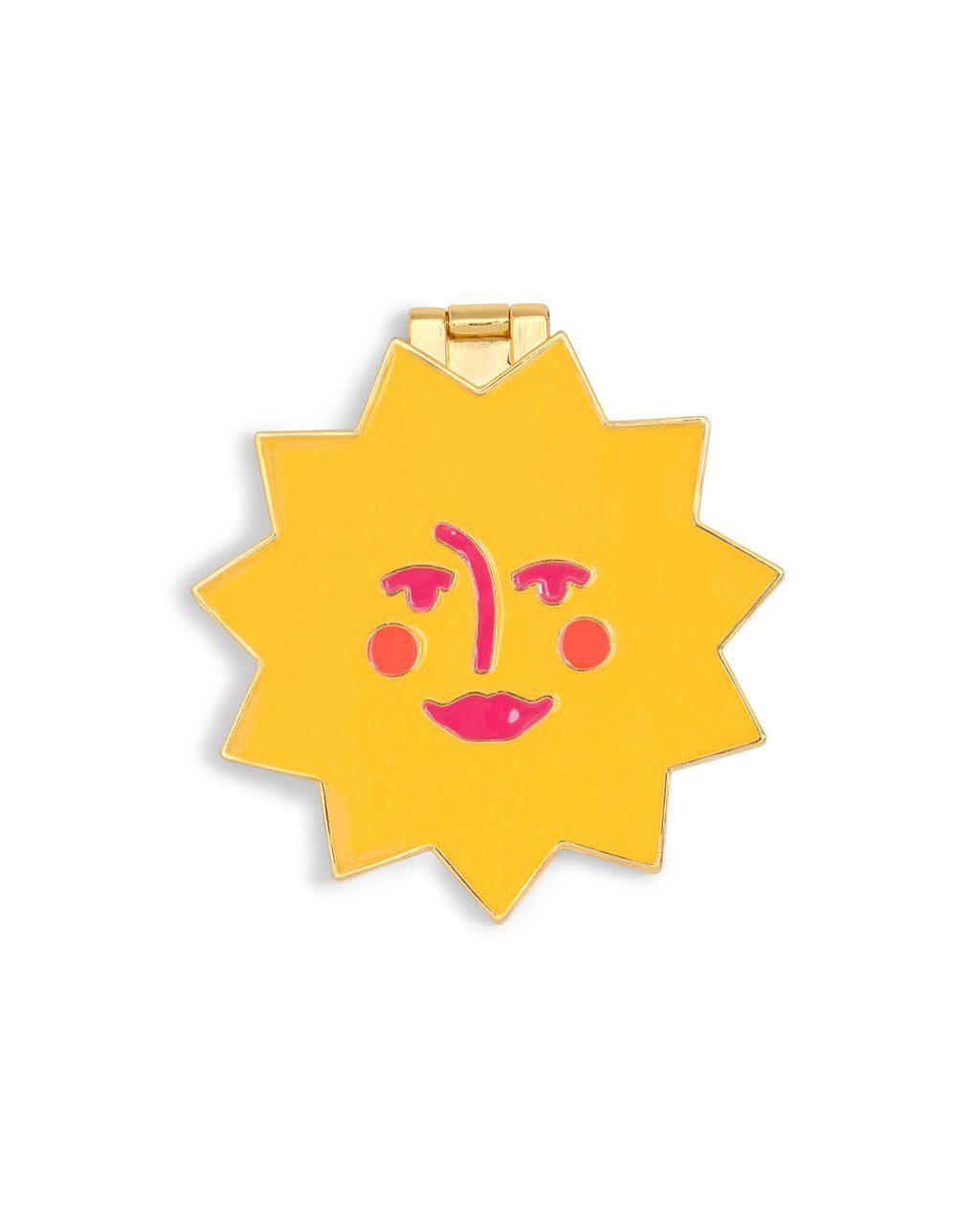 This compact mirror makes on-the-go touch-ups and post-meal teeth checks a breeze. it's shaped like a smiling sun, is made of gold metal with enamel, and has a regular mirror and a magnifying mirror inside (and a secret message)!