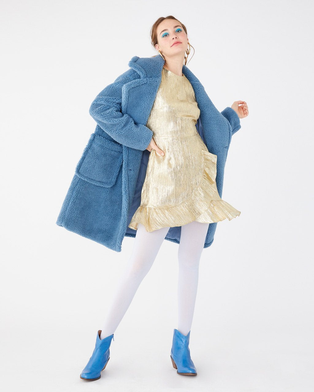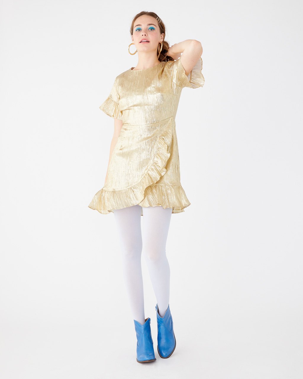 This dress is good as gold (which, as you know, is very good). With the shiniest gold textured fabric, a classic mini length, and ruffled details around the skirt, it’s sure to be a hit at New Year’s, your next Oscars viewing party, and everywhere else you want to shine bright.