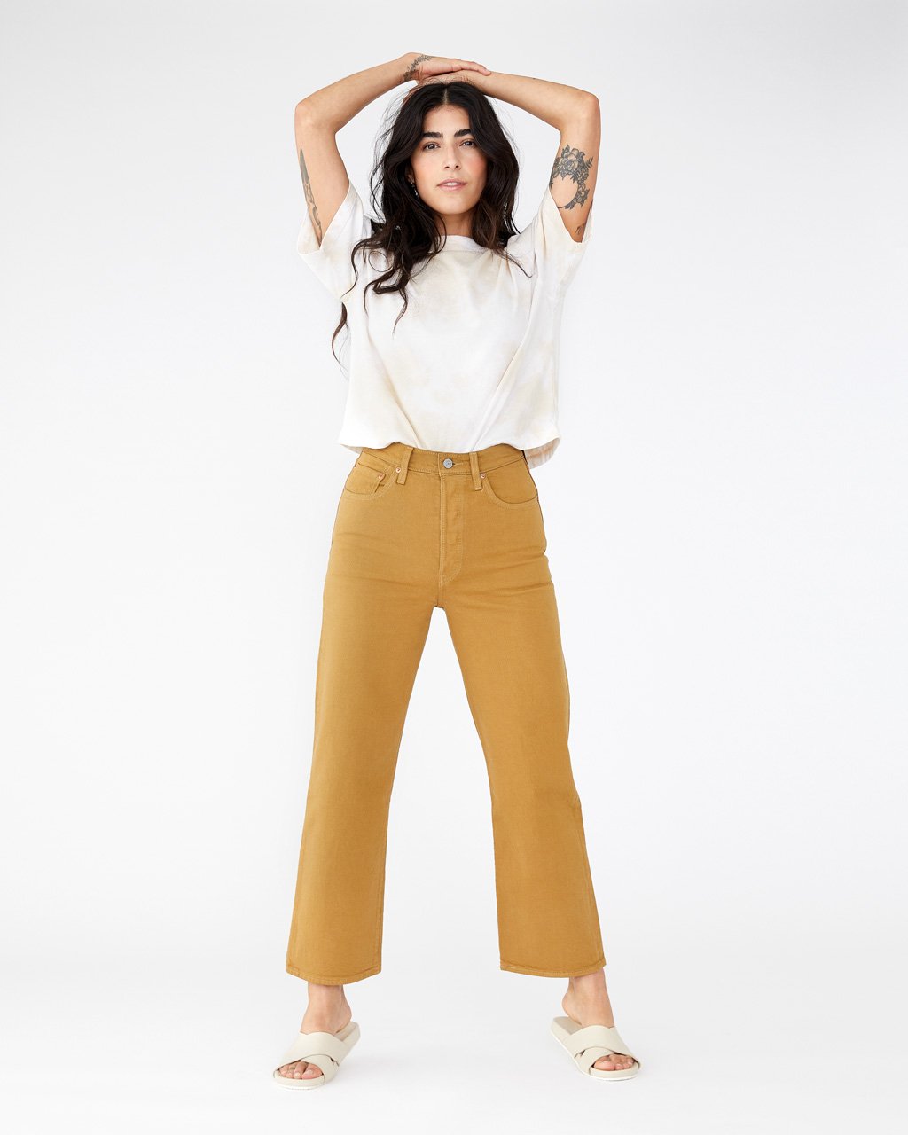 Levi's khaki dad jeans feature a straight, cropped leg that pairs perfectly with a super high waist. And they look great with a flat, bootie, sneaker, or really any shoe!