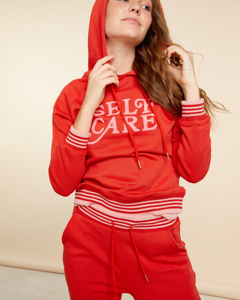 Take care. This soft, comfortable long sleeve pullover hoodie has a classic fit and a flocked design.