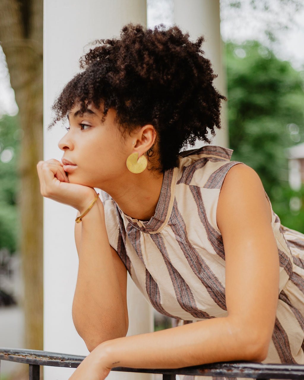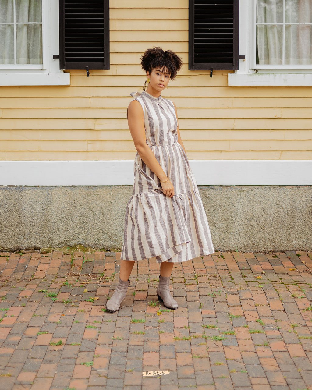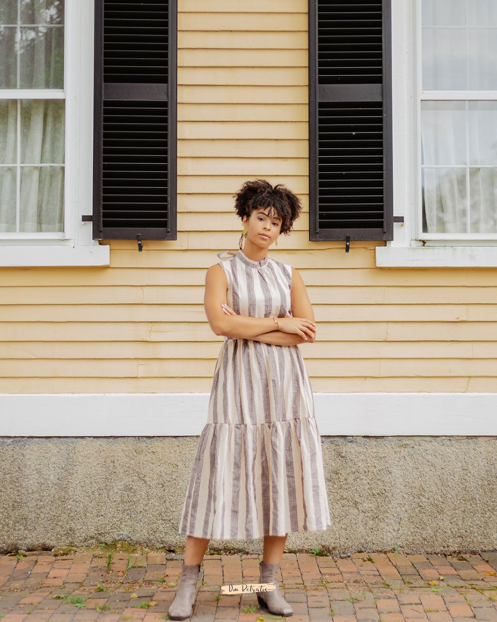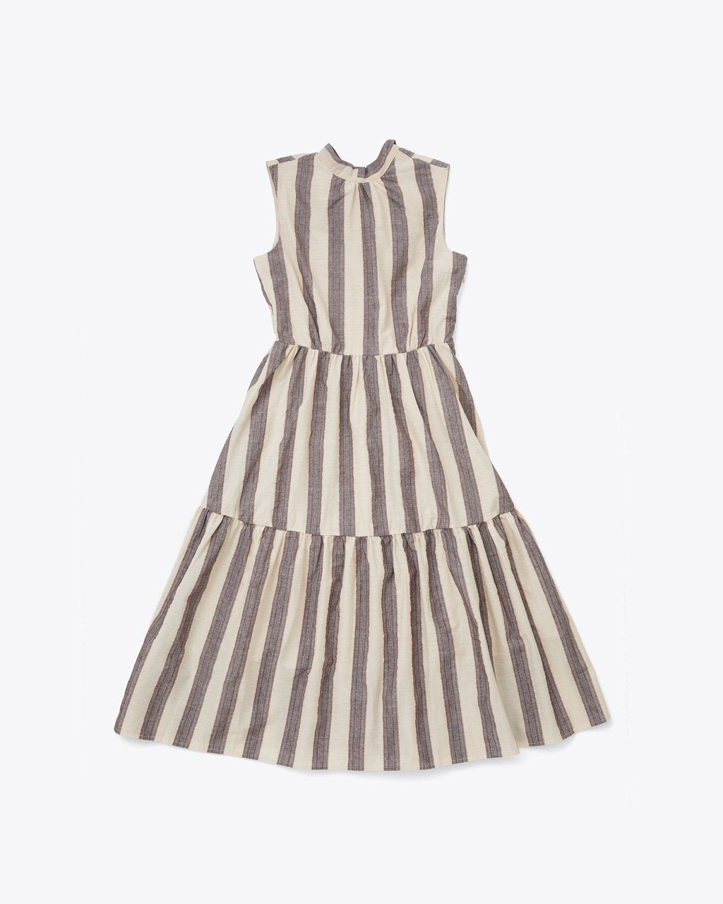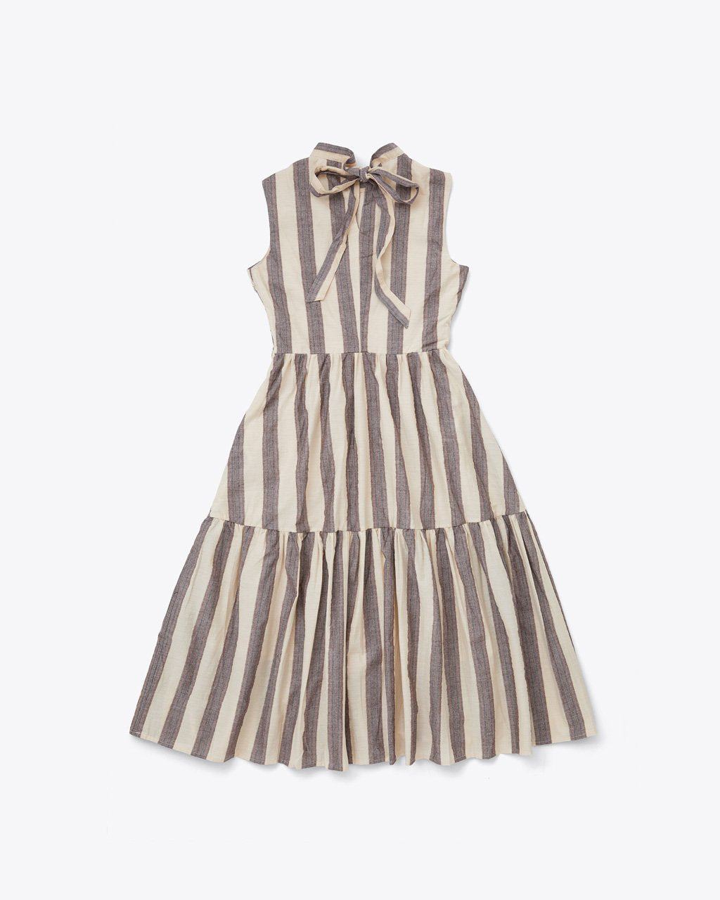 We could stay awhile in this tiered dress from Saint Geraldine. It’s got a multi-color stripe pattern (zoom in!), a sleeveless silhouette, and a mock neck that ties into a big bow in the back.