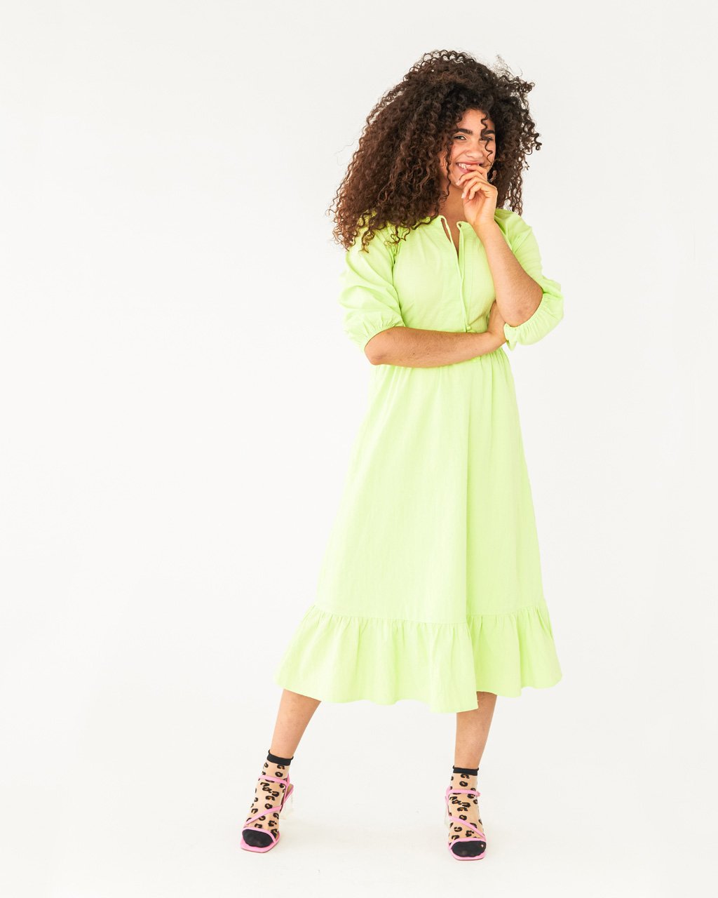 Didn’t know you needed a lime green dress until right now, did you? This one by Lost + Wander has ties at the neck, puff sleeves, and a ruffled hem.